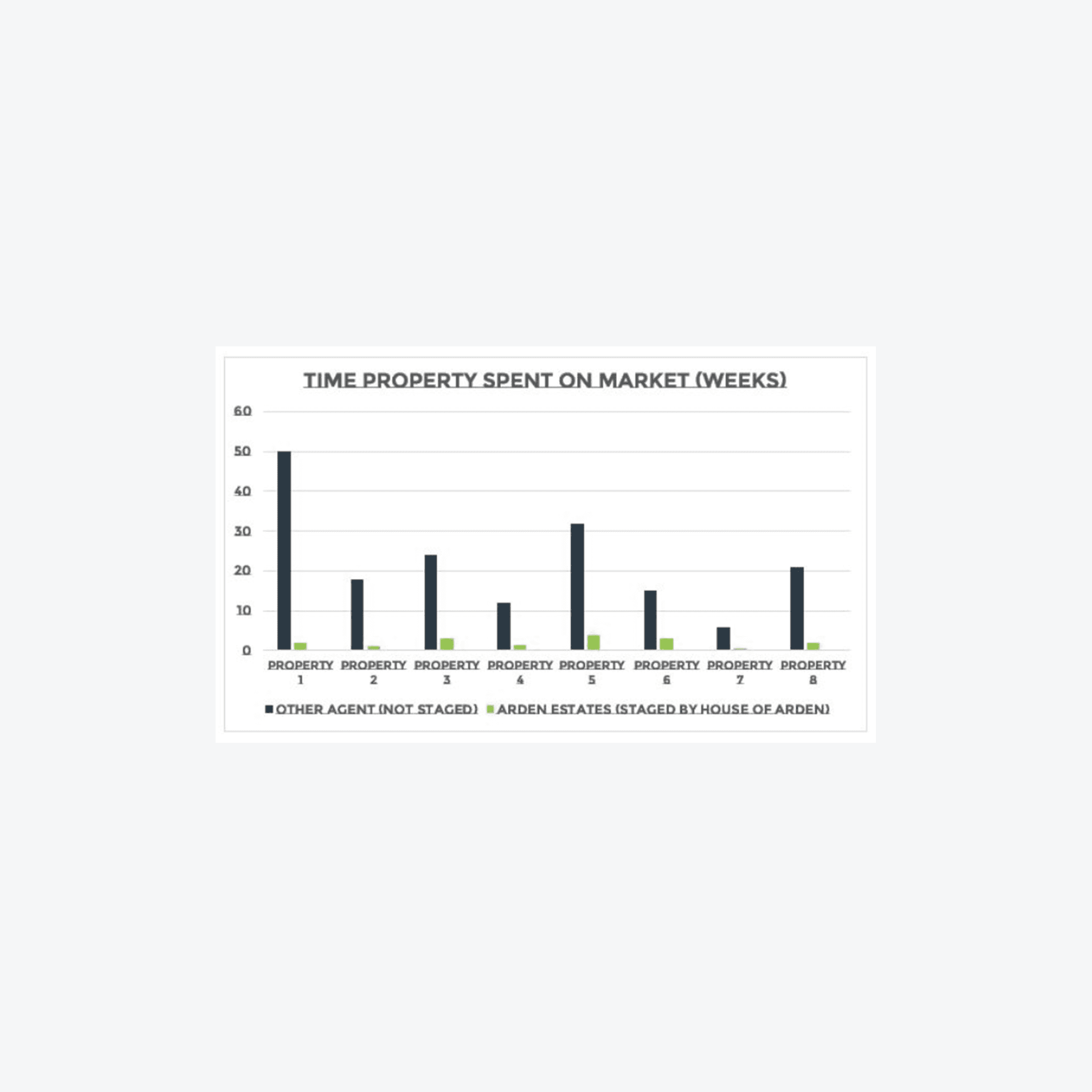 Our results speak for themselves – as you can see from the chart graphs, staging achieves a higher selling price and a considerably quicker selling time. Vendors who purchase the homestaging package can expect to achieve a selling price 5%-10% higher than if they had tried to sell the property empty. In addition, empty properties which have sat on the market for up to a year with another agent, have sold their property with Arden Estates and staged by House of Arden in considerably less time, with 95% of our staged properties selling within three weeks of going live on the market.