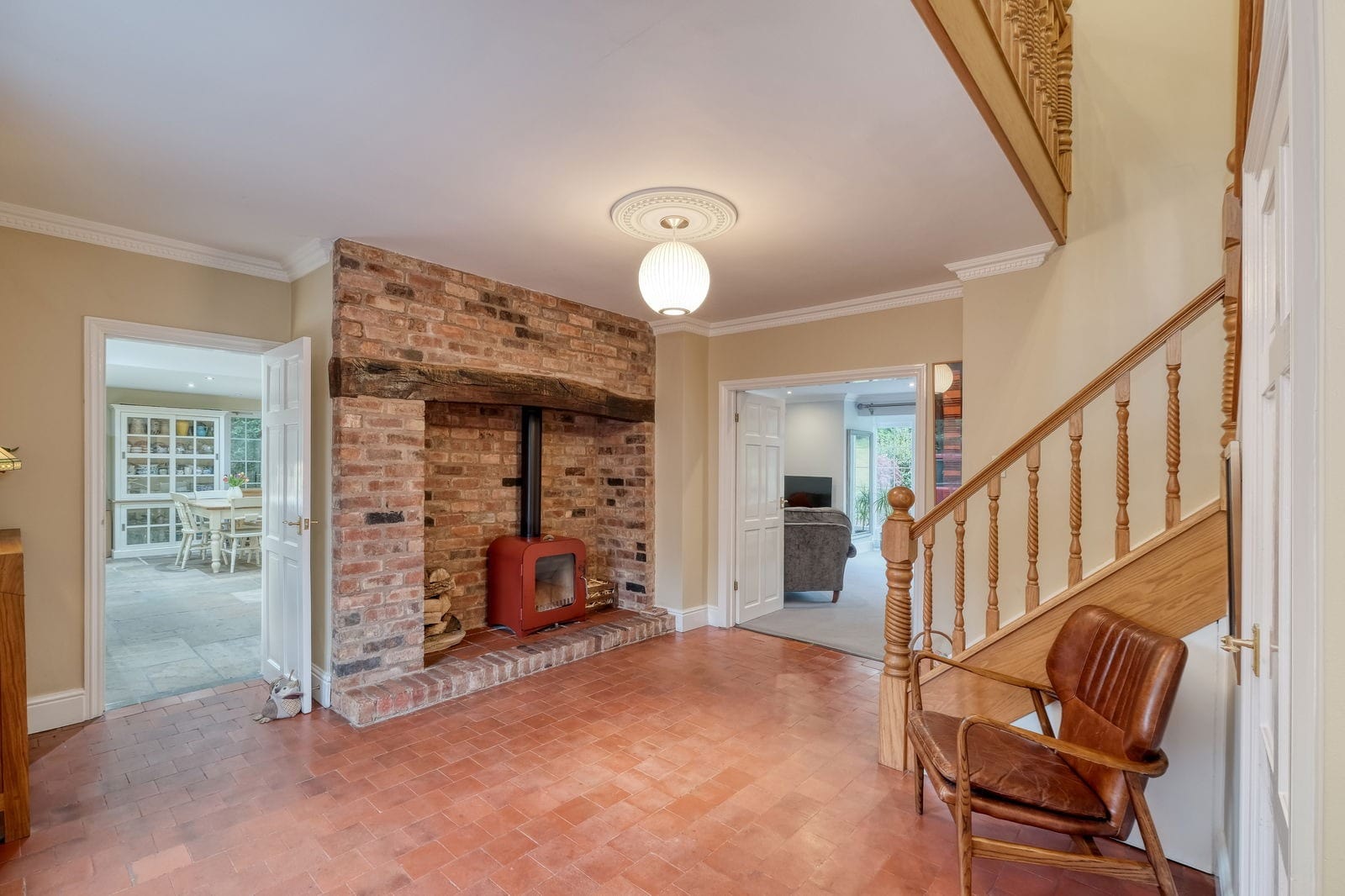 Upon entry, you're welcomed into an entrance hall of grand proportions with original quarry tile floor, wood burning stove and under stairs guest WC. There are five generous reception rooms including a living room with large bay and french doors to the garden, family room with decorative inglenook fireplace, substantial study leading to a conservatory and formal dining room with garden access.