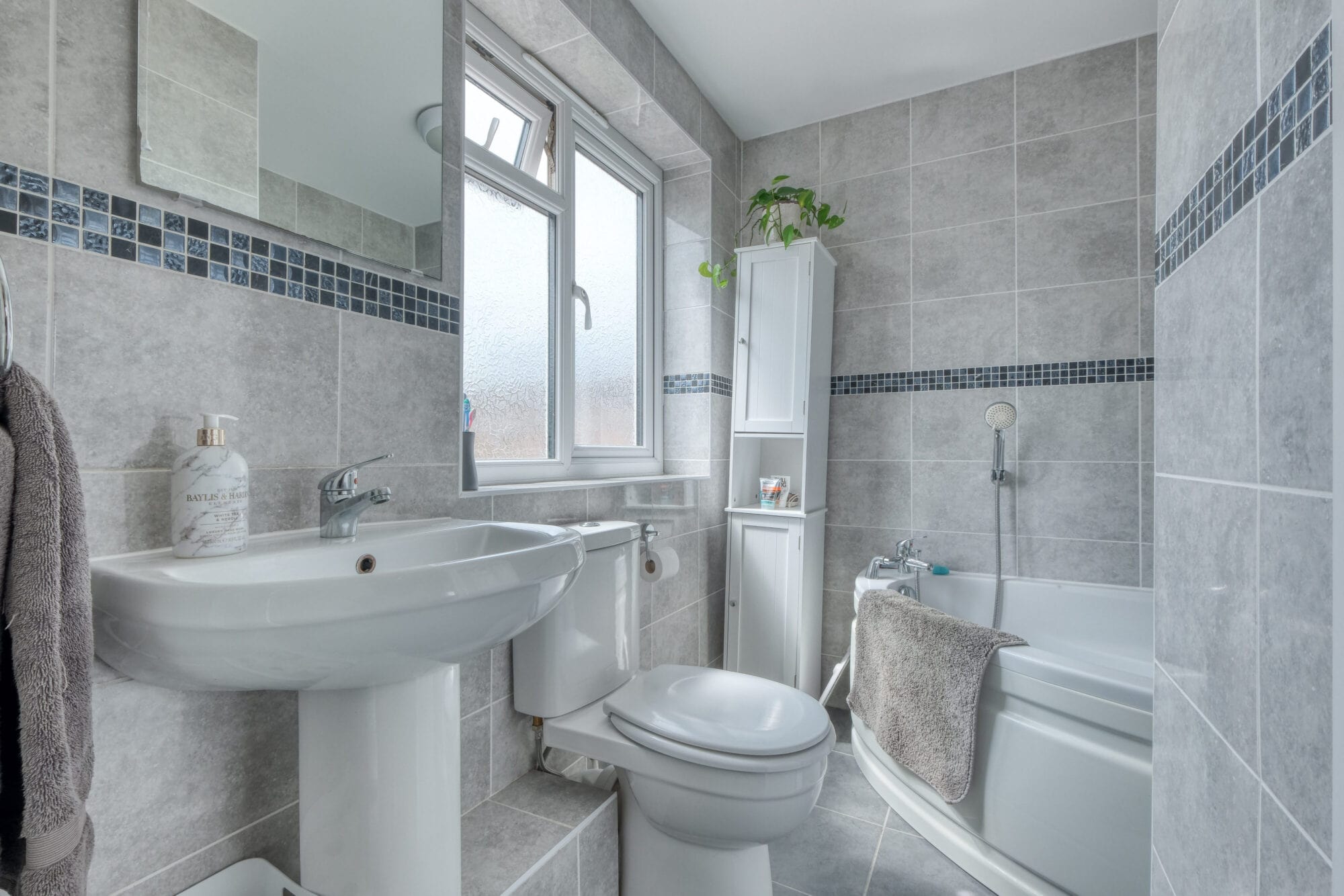 Upstairs, the first floor offers three bedrooms, two doubles, both with built-in wardrobes, and a well-proportioned single, along with a stylish family bathroom with a corner bath and overhead shower, sink and w/c.