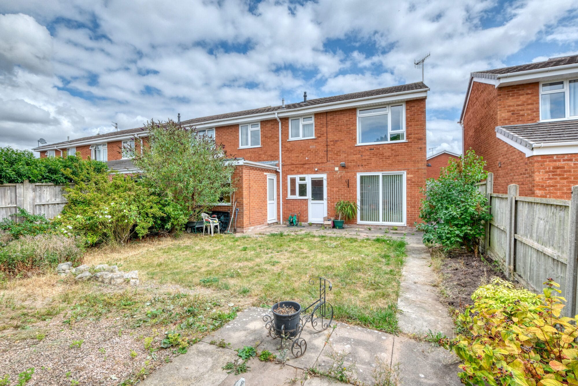Outside, the rear garden is private with mature planting, a lawn, and a patio area suitable for outdoor seating or dining.