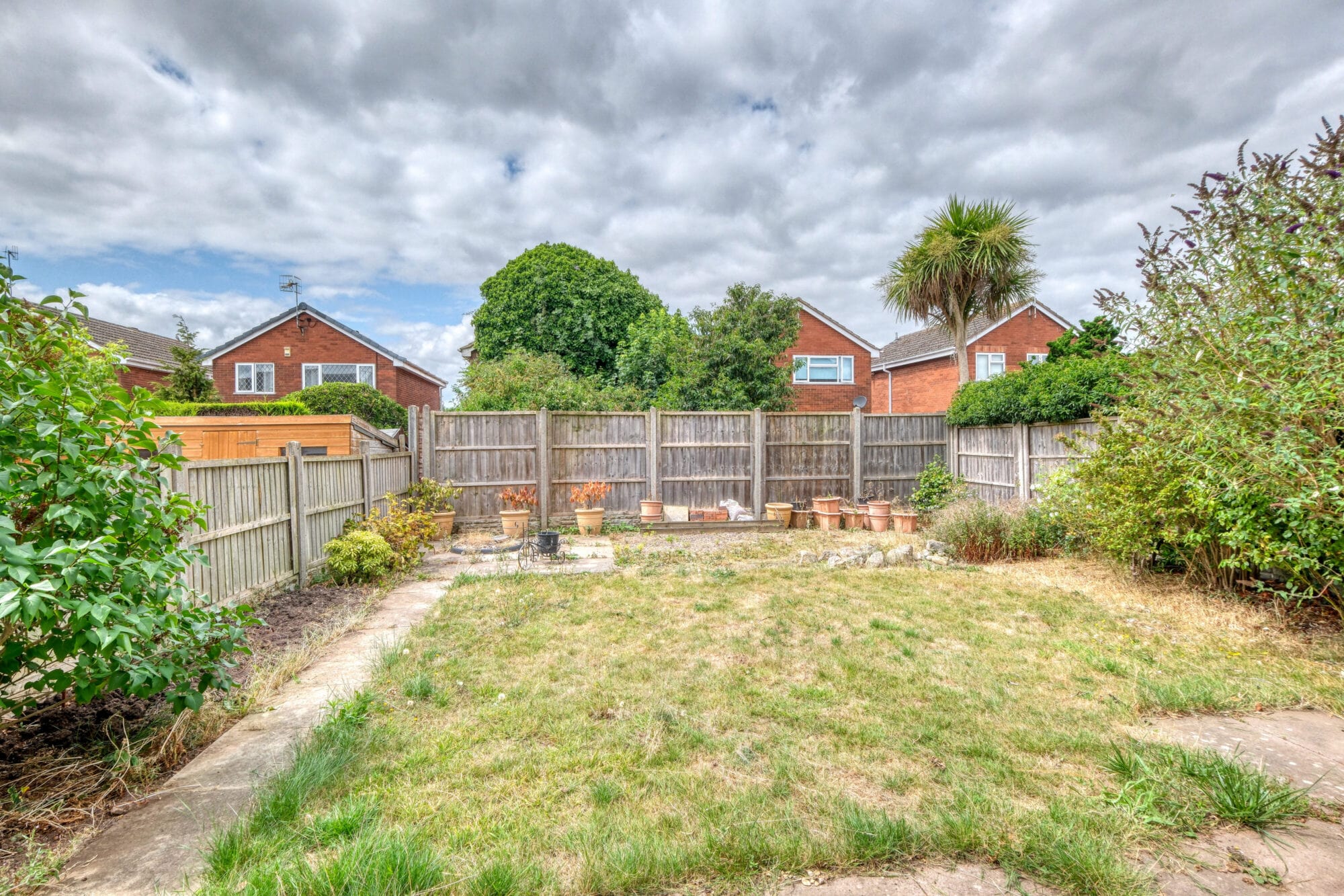 At the front of the property, there is a driveway with space for two vehicles, leading to the front entrance, garage, and side access. A laurel bush with mature shrubs adds greenery and could be removed to allow for additional parking, if needed.